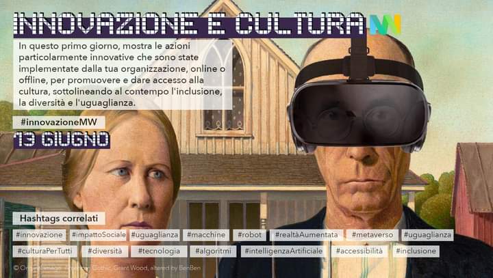 L’hashtag principale della prima giornata è “innovazione”, cui vengono correlati hashtag come “macchine”, “robot”, “realtàAumentata”, “metaverso”, “tecnologia”, “algoritmi”, “intelligenzaArtificiale”. Sullo sfondo di un dipinto in cui un personaggio viene digitalmente munito di visore, il solo proliferare di queste parole chiave abbinate al concetto di innovazione mi pare sia di per sé indicativo delle prospettive future dei musei e della loro fruizione da parte dei visitatori. E, soprattutto, è assai eloquente su ciò che tutti noi, volenti o nolenti, intendiamo ormai per “innovazione”, ossia “innovazione tecnologica”, dimenticandone il primario significato che è – trascrivo da tre dizionario a caso – “modificazione, perlopiù in meglio, dello stato di cose esistente; l’innovare, l’innovarsi e il loro risultato; introduzione di sistemi e criteri nuovi”. Stando ai dizionari, si potrebbe sostenere che la nascita della democrazia sia stata una “innovazione” ben più di quella di internet, ma oggi chi la definirebbe così?